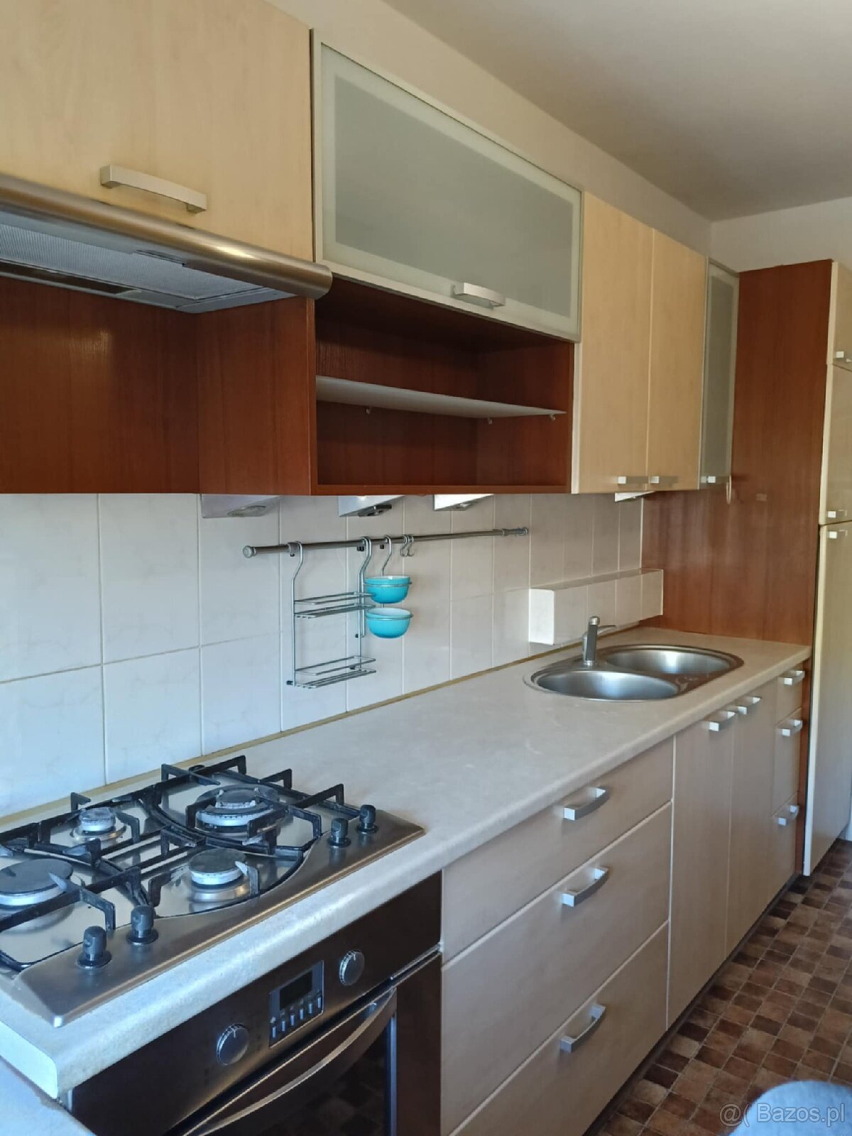Kuchnia widna, zaopatrzona w nowe meble w zabudowie, lodówkę stolik, oraz kuchenkę gazową.