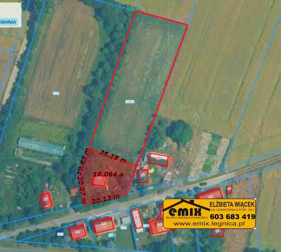 Emix Biuro Nieruchomości posiada w ofercie sprzedaży zabudowaną działkę gruntu, o łącznej pow. 0,4607 ha, położoną w miejscowości Wojciechów, w gminie Zagrodno, w powiecie złotoryjskim. Powierzchnię 0,1043 ha stanowi grunt rolny zabudowany, a pow. 0,3564 ha stanowią grunty orne i pastwiska, czyli część uprawowa o klasie RIII i RIV. Wymiary działki to ok. 126 na 35 m. Działka zabudowana jest jednokondygnacyjnym budynkiem o pow. 62 m2, oznaczonym jako budynek produkcyjny, usługowy i gospodarczy dla rolnictwa. Właściciel nieruchomości uzyskał Decyzję o warunkach zabudowy, według której możliwa jest przebudowa budynku gospodarczego na budynek mieszkalny, dzięki czemu zdecydowanie wzrasta atrakcyjność sprzedawanej działki. Budynek wybudowany został w latach 80 ubiegłego wieku, składa się z pomieszczeń gospodarskich oraz nieużytkowej części strychowej. Do budynku przybudowana jest szklarnia oraz pomieszczenie typu kotłownia. Do nieruchomości doprowadzony jest prąd, woda i kanalizacja. Dojazd do działki stanowi droga asfaltowa, utrzymywana przez Urząd Gminy. Działka położona jest w spokojnej, cichej okolicy, oddalona od pobliskiego Chojnowa o 6 km i 10 km od Złotoryi. Również atrakcyjnie prezentuje się dojazd do autostrady A4, który wynosi zaledwie 1,5 km. Serdecznie zapraszam do obejrzenia i zakupu tej nieruchomości, z uwagi na niewygórowaną jej cenę.