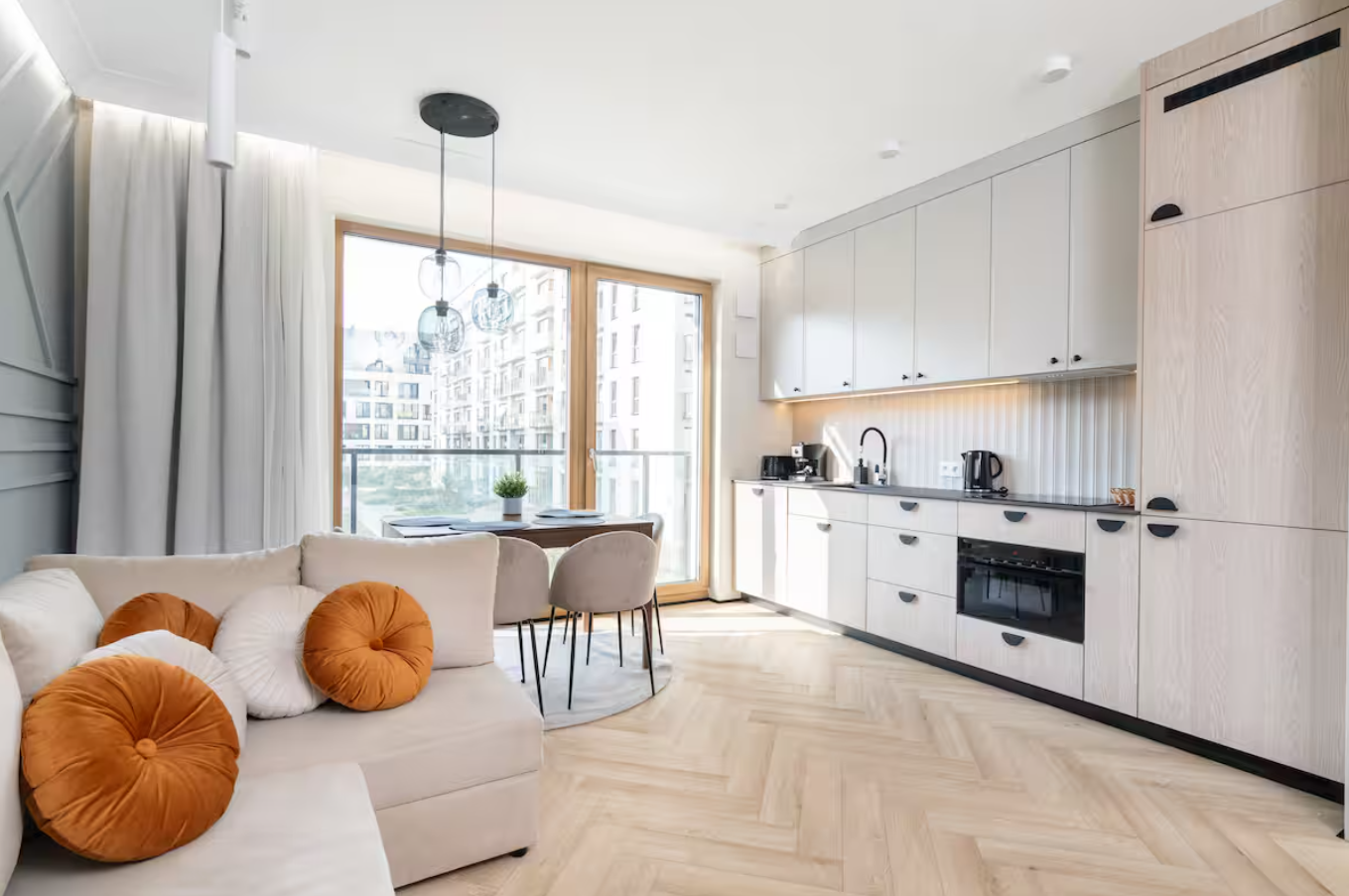 Nowoczesny apartament z balkonem i miejscem parkingowym w garażu podziemnym na Mokotowie. Jasne, ciche, z pięknym widokiem na zieleń i plac zabaw. Dwie oddzielne sypialnie gwarantują prywatność i komfort. Kuchnia jest w pełni wyposażona, ze zmywarką, mikrofalówką z grillem, tosterem, płytą indukcyjną i dużą lodówko-zamrażarką.