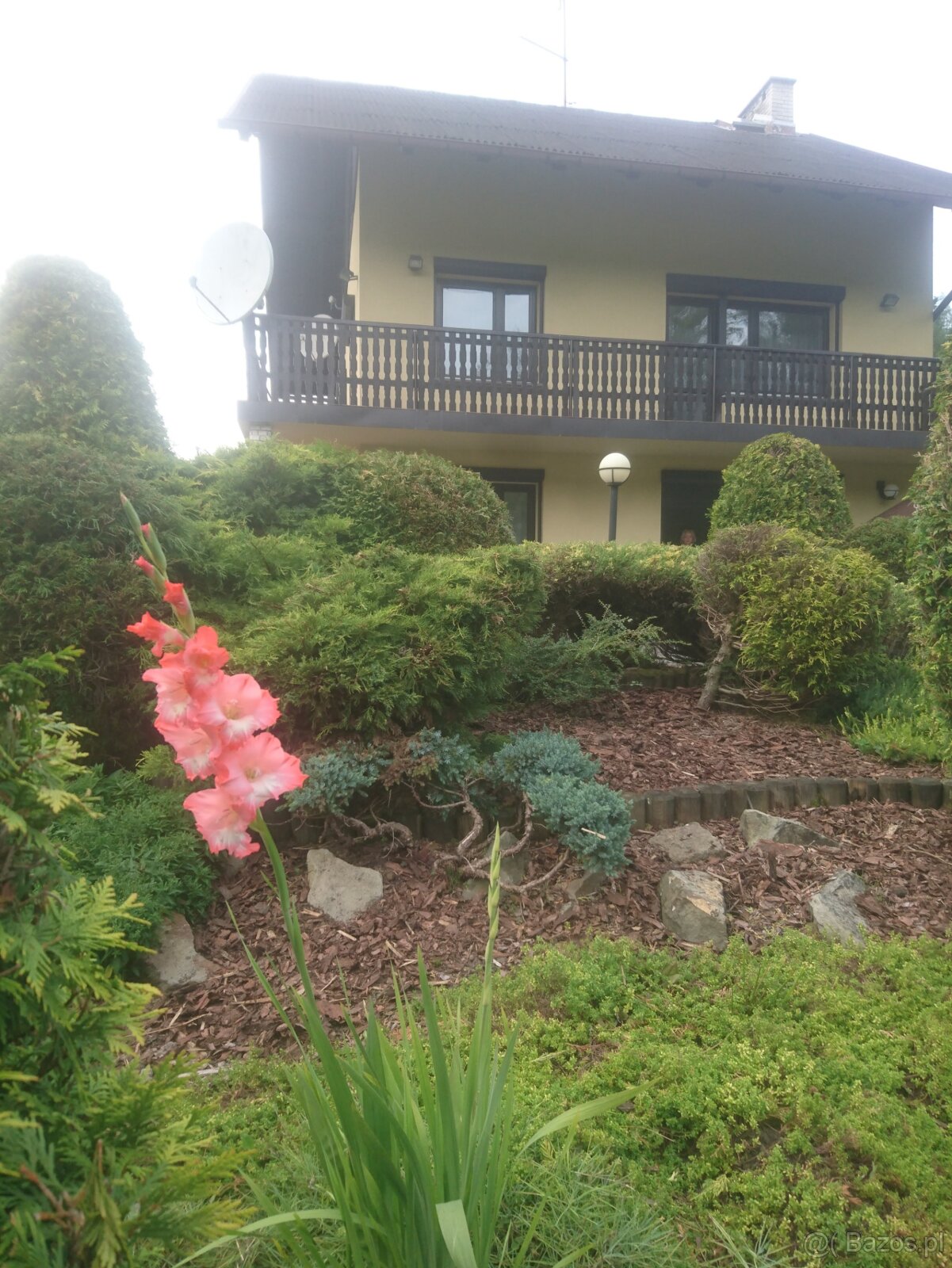 Dom z 1992 roku, posadowiony na pięknie zagospodarowanej - ogrodzonej działce o pow. 3049 m2. Na posesji znajduje się niezależny domek drewniany wyposażony w kuchnie, łazienkę i miejsca noclegowe o powierzchni 20 m2, oczko wodne, studnia z wodą, kamienny grill. W zadbanym ogrodzie są liczne nasadzenia, krzewy.
