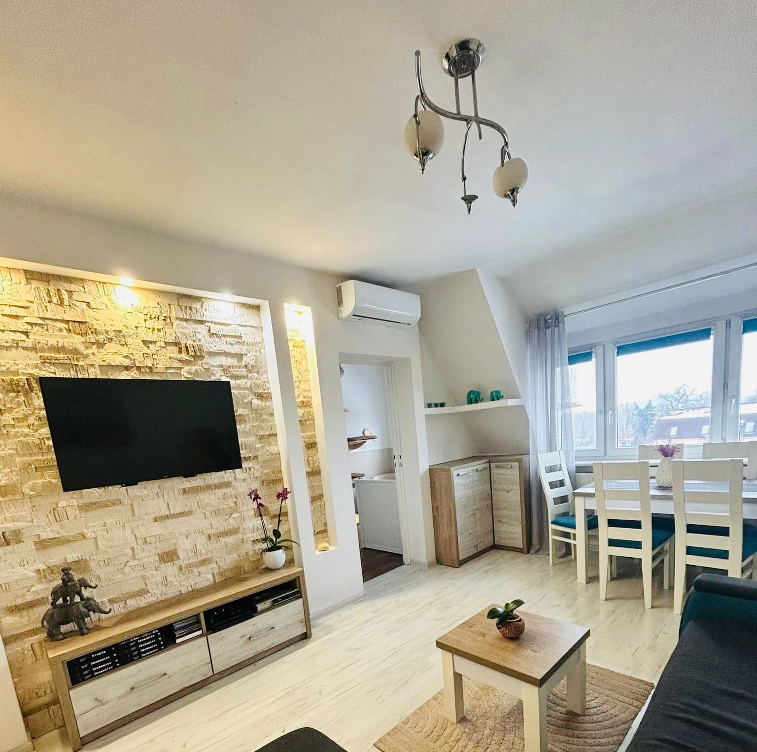 * salon: narożnik, szafka RTV, stolik kawowy, stół z krzesłami,