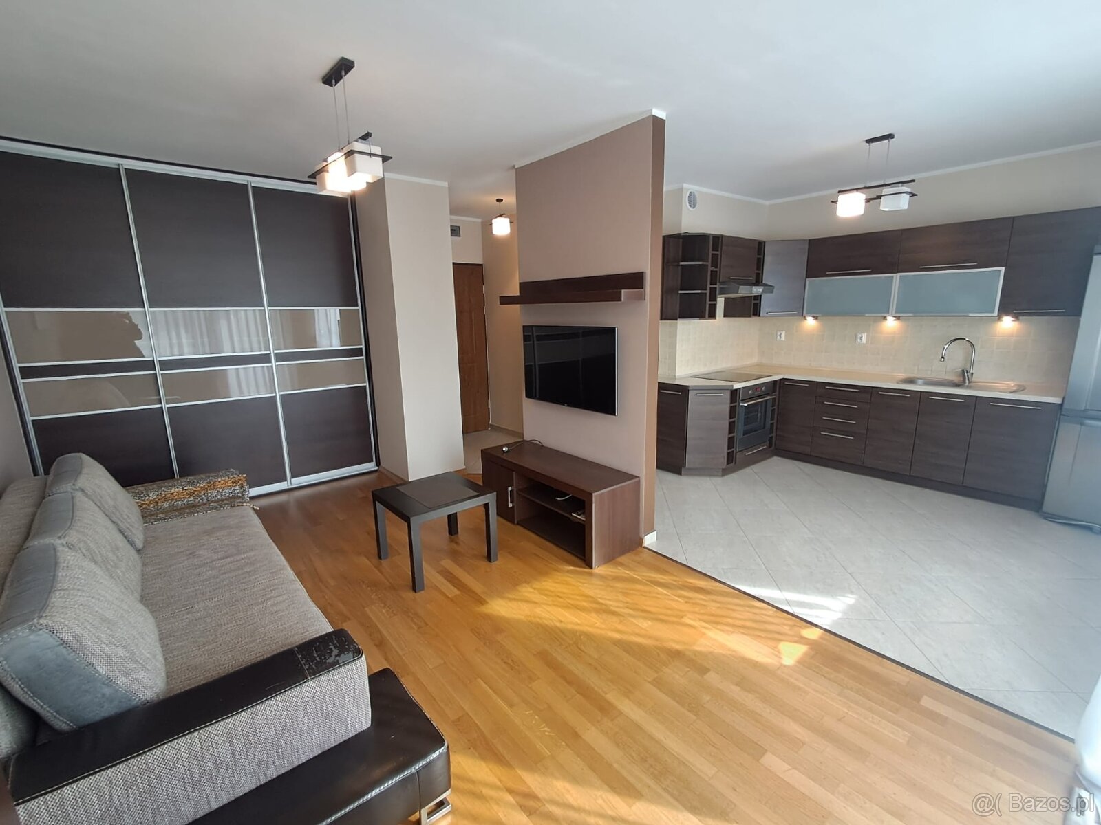 Mieszkanie jest w pełni umeblowane i gotowe do wprowadzenia bez dodatkowych nakładów finansowych. Kuchnia wyposażona została w zabudowę meblową oraz sprzęt AGD: płytę indukcyjną, piekarnik elektryczny, okap, zmywarkę i lodówkę. W pokoju znajduje się rozkładana kanapa, pojemna szafa w zabudowie oraz zestaw mebli (stolik kawowy, szafka RTV, telewizor, półki i witryna). Łazienka oferuje dużą wannę, umywalkę z lustrem oraz nowoczesny zestaw podtynkowy. W przedpokoju praktyczna zabudowa z siedziskiem i wieszakiem.