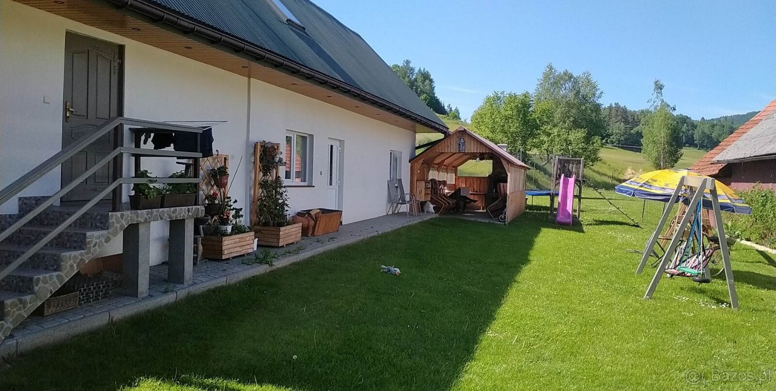 Polecam dwa apartamenty w domu murowanym, wejścia osobne. Jeden dwupoziomowy z tarasem z widokiem na ogród i góry. Na dole łóżko małżeńskie, na górze 3 łóżka pojedyncze. Drugi jedno poziomowy z wejściem prosto z podwórka ( można wjechać na wózku).W tym domku znajduje się sypialnia z podwójnym łóżkiem i łóżko piętrowe oraz w salonie za pół ścianką są dwie wersalki dwu osobowe.